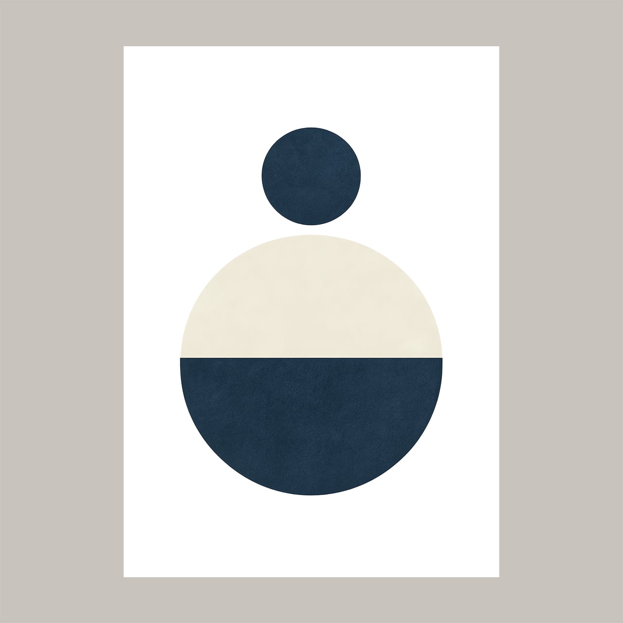 深いブルーと柔らかなホワイトで描かれた円形は、夜空に昇る月や静かな地平線を思わせます。