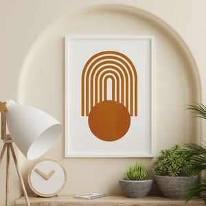 オレンジのアーチと円を組み合わせた幾何学的な抽象アートポスターです。太陽のような円と、リズム感あるアーチ型のラインが空間に温かみと動きを与えます。北欧モダン、ミッドセンチュリー、レトロスタイルのインテリアにも調和し、リビングや寝室のアクセントとして活躍する1枚です。