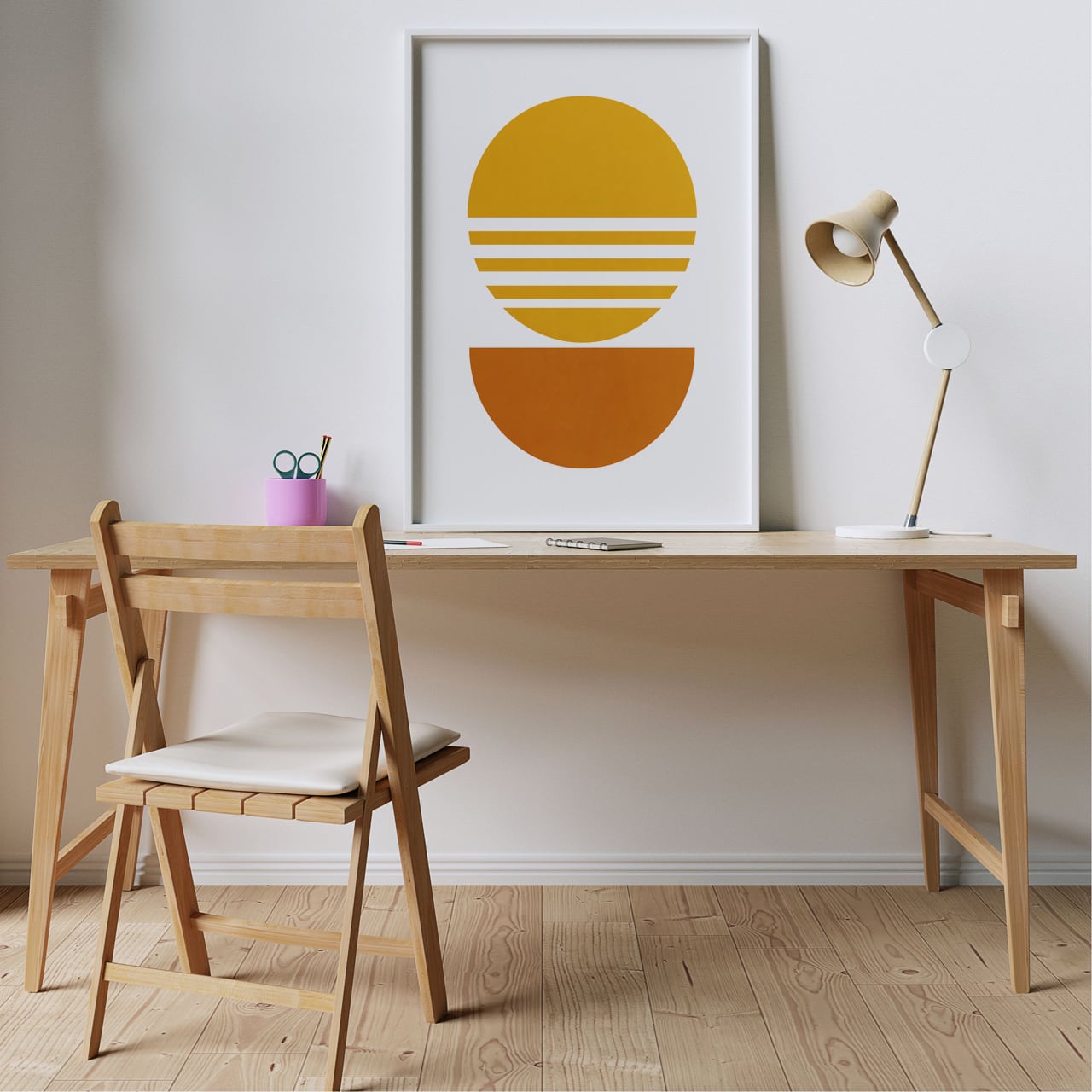 イエローとオレンジの円形をモチーフにした抽象アートポスターです。水平ラインの入ったデザインは、日の出や夕暮れの光景を思わせ、空間に温かみとリズムをもたらします。北欧モダンやミッドセンチュリー、レトロインテリアとの相性も良く、リビングや寝室、ワークスペースにアクセントを加える1枚です。