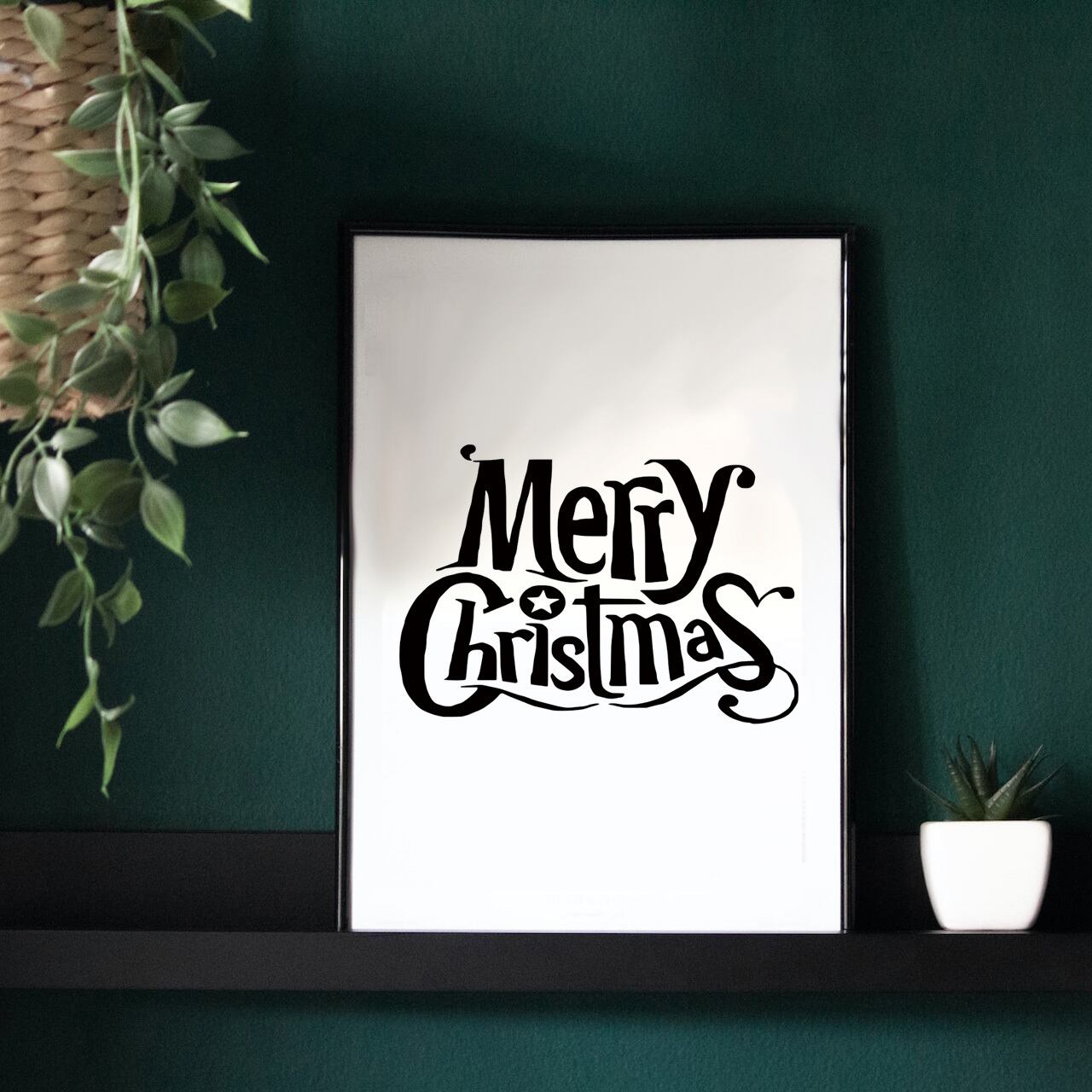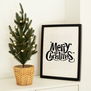 「Merry Christmas」の文字をアートのようにデザインした、モノトーンのクリスマスポスター。