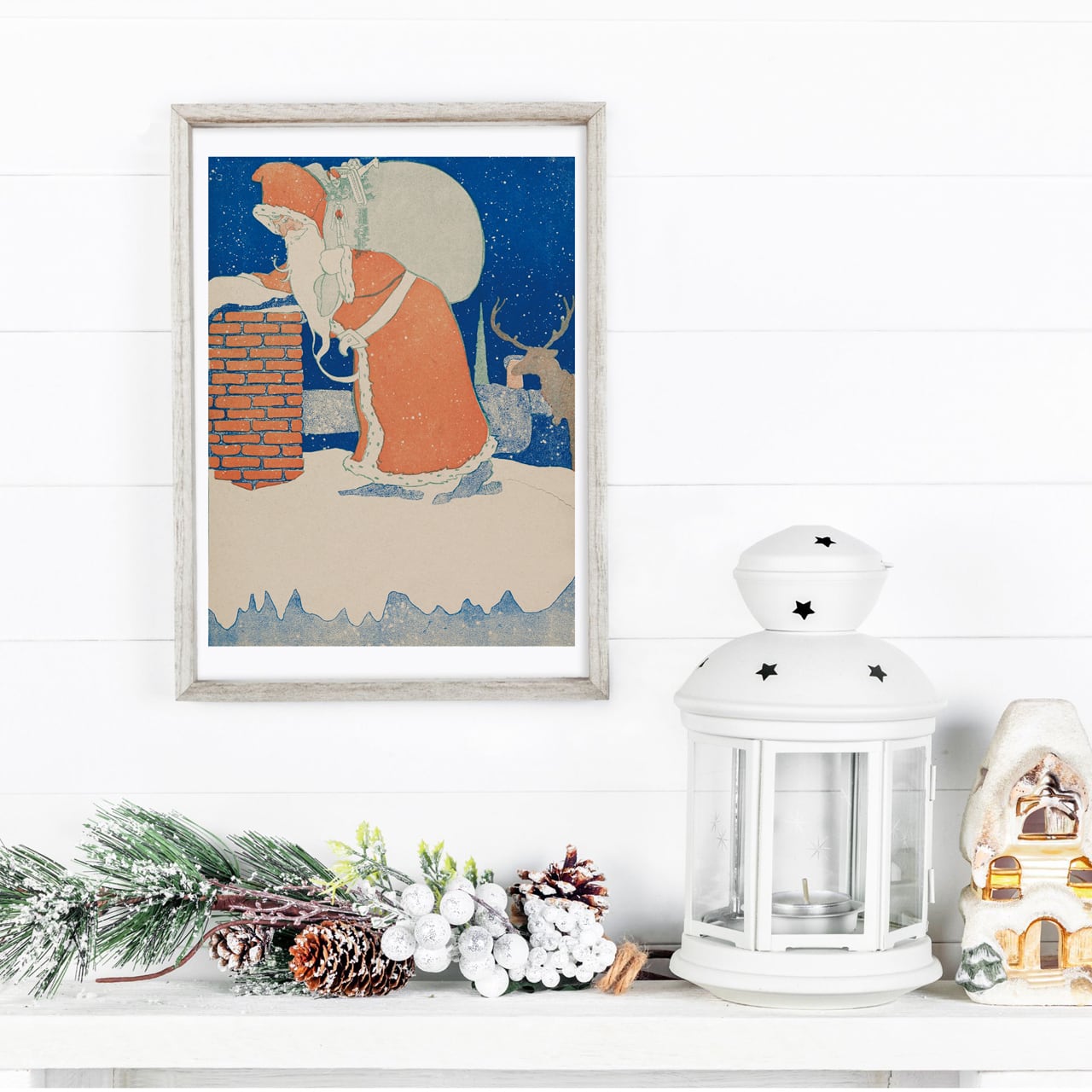 夜空の星の下、屋根の上から煙突を覗くサンタクロースを描いたクラシックなクリスマスポスター。